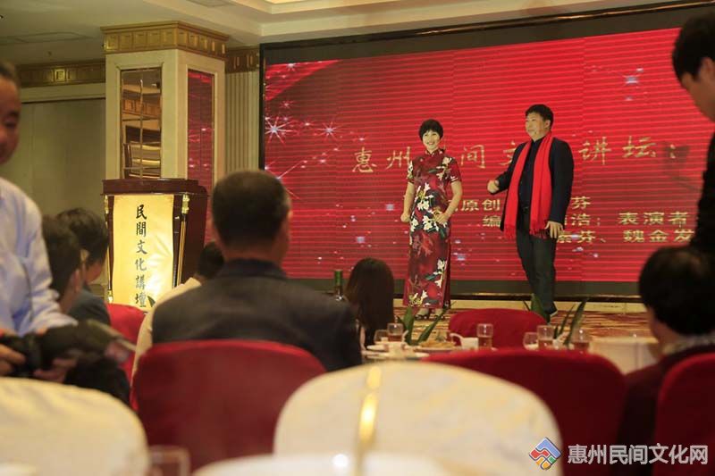 紧接着,惠州市民间文艺家协会2017年新春同乐会开始,以新会员为主,展示才艺。舞台上,是精彩的文艺表演、激动人心的抽奖;台下,气氛也热烈异常,会场后座书画家现场挥毫;全场喜气洋洋,民间文艺家争相出彩!文艺节目有醒狮贺岁、渔歌、客家山歌、龙门本地山歌、粤语歌、京剧、客家童谣、舞春牛、汉服表演、歌剧选段、小戏、歌舞、武术,有葫芦丝、二胡、埙等独奏,还有小品《惠州民间文化讲坛:民间灯会》……精彩加喝彩,台下掌声不停,笑声不断。会员们纷纷表示,这是民协人的“春晚”,能在一起共度这美好的时光,十分有意义。