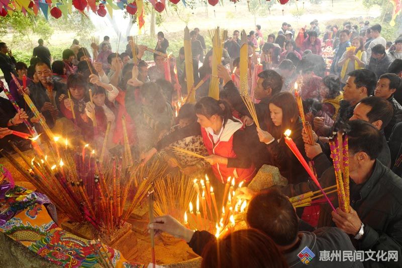 怪不得,我左看右看,横竖认为他们是在拜树伯公。村书记坚定地告诉我,今天是二大王的诞辰日,我们在给他祝寿。大王爷是二月初五在东升岛,三王爷是二月二十五在稔山长排村。闻听此言,我只好又去细细打量。大榕树独木成林,像一把巨伞,据说已有150多岁。伞下一平米见方的高地上,几块青石板围个半月形,中间香炉上刻着“二大王”。石坛前面摆放着两张石桌、木桌。石桌上烧着香烛香烟,木桌上摆放各种祭品:鸡鱼肉、苹果桔子、粉丝腐竹,红色发糕上面插着绿松,三杯清酒六杯茶。最特别是供饼,有大有小。大如面盆,小似巴掌,都成米黄色。心形小供饼,上书红色“福”字,10个一袋堆在两个纸箱里。大供饼只有5个,摆在供桌前面。四个圆形,红底黑芝麻写着“合境平安”。中间一个寿桃形,上书一个合体的“福寿禄”。