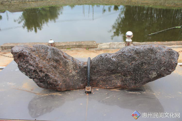 在龙门县龙潭镇铁岗社区马岭村杨屋厦围的祠堂前,安放了一块重达281公斤、形似卧牛的“铁牛石” 又称之“神牛” 石。“铁牛石”呈灰黑色,形状如牛,该陨石形态生动、纹理清晰、质感柔和,长1米多,表面布满浅坑。这块被热传为天外陨石的 “铁牛石”一直被村民奉为神物。