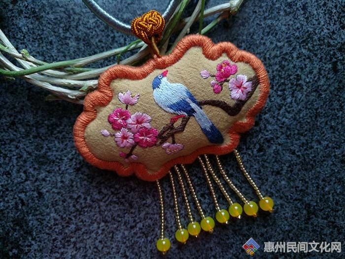 璎珞原为古代印度佛像颈间的一种装饰,后来随着佛教一起传入我国。在唐代时,被爱美求新的女性所模仿和改进,变成了项饰。这一系列项链借鉴了璎珞缀有如意锁造型的坠饰,上面绣有蝙蝠、仙鹤、喜鹊、鹿的图案,喻意保佑佩戴者平安富贵长寿。虽非我的原创,但我在细节处做了改动,还加了金线,使作品更加细腻精致。