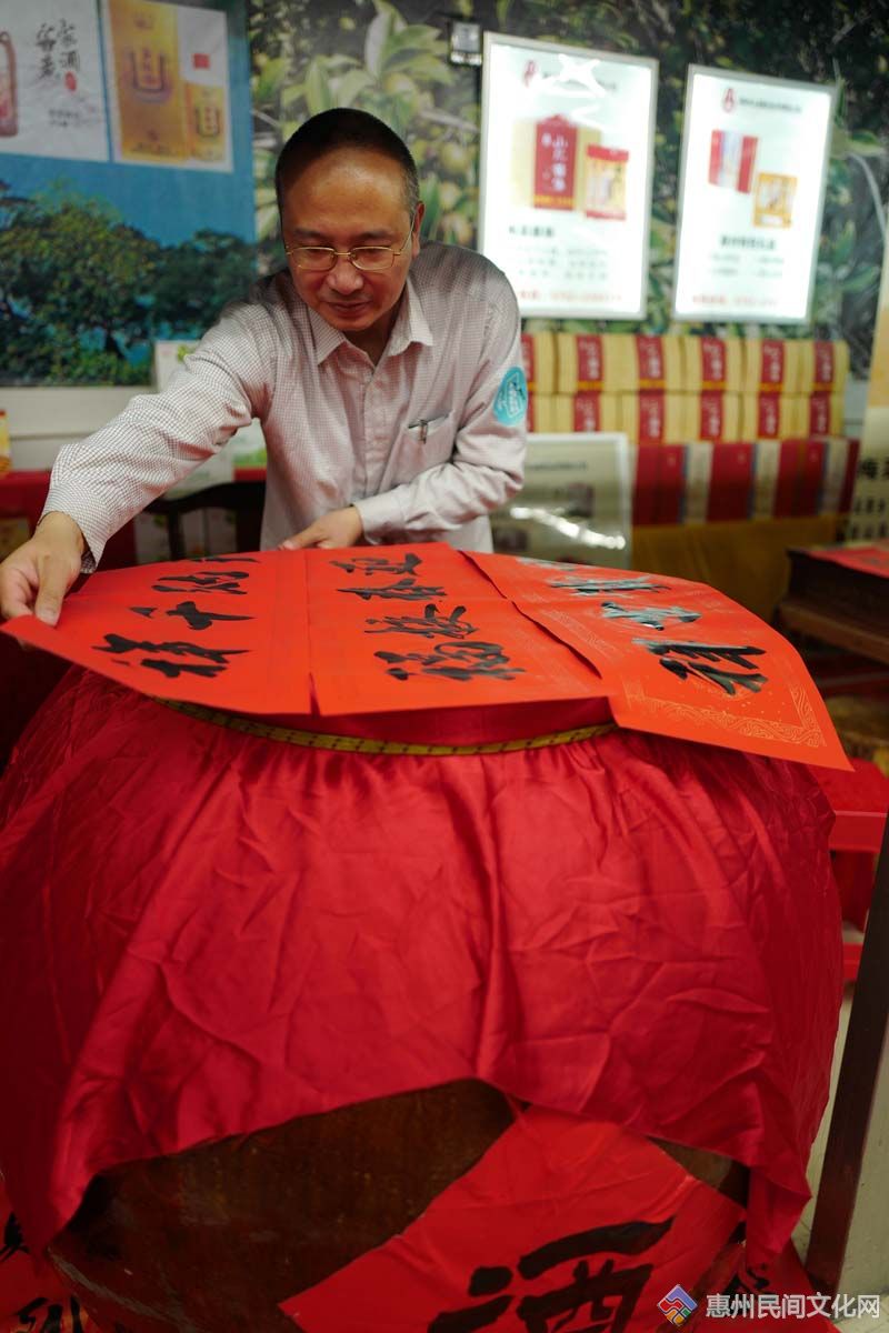 一踏进艺术馆,汹涌的嘈杂声携带着淡淡的墨香,迎面扑来。定睛一看,偌大个馆场,被挤得水泄不通。14名书法家各据一方埋头奋书,各自的粉丝将他们团团围住。透过缝隙,只见或黑或花白或银发的脑袋在起伏。书法家们平均年龄几近50多岁,可他们一站就是3个多小时,中间上个卫生间都是百米冲刺的速度。下午4点多的时候,馆内的舞台上、地板上、柜台上,甚至酒缸上凳子上,凡是稍为平坦一点的空间,都铺满了各种各样的春联。旁边或蹲或站的人们,如同红色海洋中一只只觅食的白鹭,聚精会神地盯着自己的春联,不时用手扇下风,或嘟嘴吹吹湿浓的墨迹。