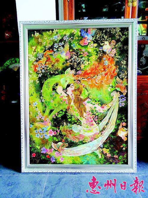 苏汉洪的烙画作品。 “2013南国书香节暨第三届惠州书展”(以下简称“惠州书展”) 人物:庄敏和小朋友们 参展作品:贴有画作的纸箱、14件泥塑作品 小朋友画作贴在纸箱上展出 走进市民间文艺家协会(下简称“民协”)会员庄敏的绘画工作室,仿佛置身于一个儿童艺术乐园。小小的工作室内,四周墙壁上挂 纸箱四面将贴上小朋友们的得意画作,这些画作将在艺博会上与市民见面。有胖乎乎的小黄猫迈着慵懒的脚步;大哥哥带着小妹妹在小河中撑船;蘑菇状的小房子似乎随时会动起来……小朋友们用画笔勾勒出一幅幅充满童趣的图画。纸箱上除了有小朋友们的画,也有画室老师的作品。几个大纸箱上绘出的彩色图案拼凑在一起,拼出了一位威武霸气的门神。这个门神就像守护神一样,届时也会展出。 记者在现场发现了一样很有创意的作品。创作者是家住惠城区的小林,小林今年18岁,从小在工作室学习画画,她把3把油漆刷画成小人的模样,刷毛涂上颜色变成了小人的头发,两大一小的“刷子人”组成一个温暖幸福的家庭。 传统与现代相结合绘出狮子泥塑画 庄敏今年42岁,从事美术教育20余年。作为此次博览会的参展者之一,庄敏也拿出了14件作品参展,“这14件作品都是 我 自己 捏制的泥塑作品,共花费了约3个月的制作时间。” 庄敏说,14件泥塑作品以古村落素材做成的浮雕装饰画为主打。作品中,最吸引人的要数两幅泥塑狮子浮雕装饰画。一幅以黑色作为底色,四周以金色的瓦作为装饰,中间站立的银色小狮子两眼炯炯有神地望向远方。另一幅浮雕装饰画同样以黑色作为底色,金色小狮子横躺在画纸中间,嘴角微微上扬,活灵活现。“这两头泥塑小狮子和传统的石狮子不一样,我把古村落大门和屋梁上传统的小狮子装饰融入现代艺术风格,用泥塑与绘画相结合的手法创造作品。”庄敏说,现代工艺的泥狮子和传统的石狮子形象相差甚远,现代工艺的泥狮子更特别,更具有艺术性。 庄敏的泥塑画,看起来特别有立体感,她制作泥塑所用的原料,是经过近10年的试验,根据本土配方,结合惠州的泥土性质,反复试验研制而成的。传统的泥制作的作品容易干裂、脱、散,惹虫子,而她配制的泥环保,制成的装饰画经久耐用,非常适合放在家里当艺术装饰品。 人物:吕媛 参展作品:东江沙画《美女与鹿》、4幅《龙凤呈祥》组画 绘制一幅东江沙画耗时大半年 在惠州民间工艺美术馆东江沙画工作室工作的吕媛,这次也有多幅东江沙画作品参展。吕媛说,东江沙画是在景泰蓝画的基础上发展起来的,与普通的景泰蓝画有些不同,用细铜丝做成图案的模样后,再用彩色的沙子填上去,然后用胶水封好,一幅美丽的东江沙画就“画”成了。 这次吕媛参展的作品有一幅是《美女与鹿》,这是一幅与爱情有关、带有神话色彩的东江沙画:画面上,一个美丽的少女与一只鹿在缠绵,周围有不少的鲜花和小鸟。这幅画中有7只小鸟,代表七夕节,寓意着爱情题材。画面上的鹿是一只雄鹿,头上的角喷出红红的火焰,代表着燃烧的爱情。画面上的鸟是普通的麻雀,花也是山中野花,用这些普通的鸟和花,表现普通人的爱情。这幅画吕媛费了不少工夫。从今年春节后开始“画”,每天都不曾停歇,近期才完全做好。记者看到,这幅画有些像油画,又有些像漆画。 吕媛这次参展的作品中,还有一组4幅的《龙凤呈祥》组画。这4幅画是她受到惠阳区良井镇古村落的一些图画和雕塑的漆画触动创作的。古村落主梁上的龙头画,成为了她的龙字画,古村落墙上的一只凤,成为了她的凤字画。美丽的凤凰在花丛中飞舞,但被一个框围住,寓意着封建社会的女人,虽然生活富足,但被无数的条条框框困住了。呈祥两幅画,都是吕媛在古村落大门上看到的画,画中有插着花的瓶子,寓意着岁岁平安;美丽的牡丹花盛开,蝴蝶在花丛中飞舞,寓意着花开富贵,富有生命力。 用了3年时间找到做封面的材料 1958年出生的吕媛画东江沙画是半路出家。她原来是一个文字工作者,偶尔画画黑板报,认认真真地作画还是2008年后。有一次她在深圳看到了景泰蓝画,觉得很有意思,仔细观察了很久,然后自己去找材料来“画”。凭着自己原有的一点点绘画基础,加上会画画的丈夫帮忙,开始了用彩色沙子填上去的景泰蓝画创作。 在丈夫帮忙下,吕媛画这种景泰蓝画虽然不会很难,但要做好画面的封面处理就很不容易了。她想了很多方法来处理,有些原料涂上去,画面就卷了起来,有些涂上去,画面出现裂纹。用了3年时间,报废了20多幅画后,吕媛终于找到了做封面的材料,景泰蓝画终于“画”成功了。吕媛将自己“画”的加沙子的景泰蓝画,称为东江沙画。吕媛喜欢用东江沙画来表现爱情,如今她在画一幅大亚湾渔家新娘,新娘美丽的头饰在吕媛手下,一点点地表现出来,“新娘面朝大海,盼望着丈夫归来。” 人物:苏汉洪 参展作品:约10幅惠州风光作品,《我的梦·根的记忆》灵感源自《清明上河图》 乡村题材烙画作品追寻家乡记忆 在远处连绵群山映衬下,一座古屋呈现眼前。古屋旁的街道上热闹非凡:一支迎亲队伍踏着欢快的步伐奏响幸福的乐章;市集里,有人挑着担子吆喝叫卖,有人在帮衬凉茶铺、米粉店;月牙湖畔,留洋回乡的绅士 这幅烙画名叫《我的梦·根的记忆》,出自烙画画家苏汉洪之手。苏汉洪告诉记者,今年4月份接到参展通知后,他便开始驾车在大亚湾寻找关