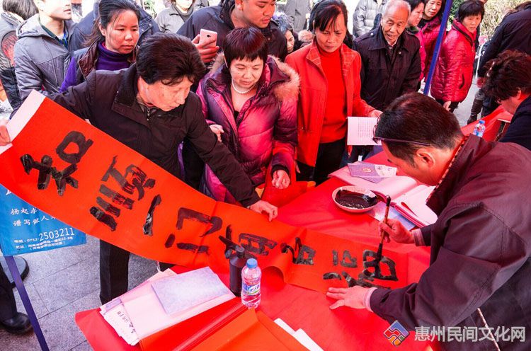 2月8日上午9时,市区河南岸公园广场人头涌涌,挤满了群众,惠州市民间文艺家协会10名书法会员参加市文联举办的2015新春送春联活动。书法家们热情高涨,在现场埋头挥毫,向百姓献上美好的新春祝福。市民们对书法家赞叹不已,围在台前排起了长队。书法家们为满足大家的需求,一幅接一幅地写个不停,忙得连喝口水都顾不上,从9时开始写到12时30分,共写了800幅对联,同时还在现场送出春联2200幅。