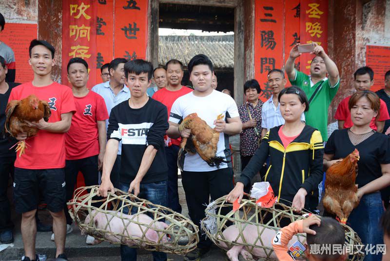 抢炮头活动就更有意思了,只见冲天炮“啾——嘣”一声冲向天际,随即炸开一团白烟,底下的人群一片欢腾,纷纷仰着头,追逐绑着彩头的炮杆,在炮杆即将落下时,众人一跃而起,一把抓住炮杆,打开里面写有奖品的利是封,到领奖台兑换奖品。今年,王屋村民小组的奖品有两头猪仔、少量公鸡、不等额度红包等,现场人人喜笑颜开。而抢到猪仔奖品的村民王大哥更是乐道:“炮头是好运的象征,咱们抢炮头并不在于奖品的大小,主要是为了讨个好彩头。”