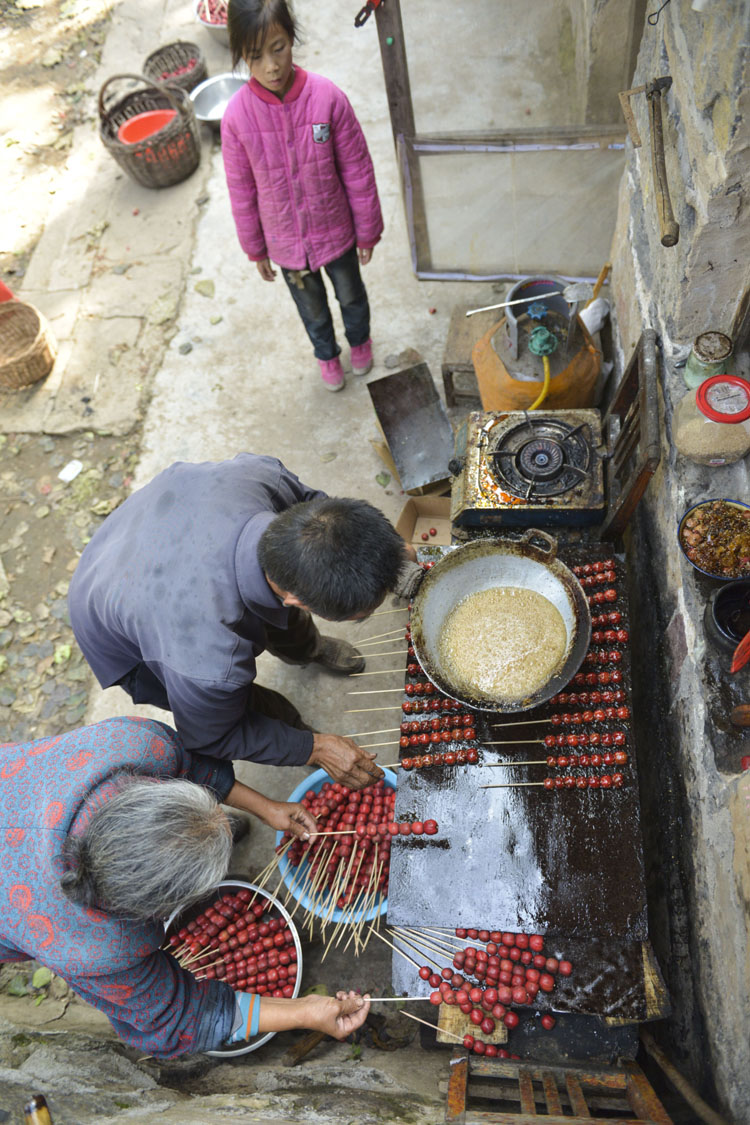 其实,原本我只是想帮驴友们拍几张有山里特色的照片而已。你知道,玩摄影的人都这德性,每拍一张照片,都要讲究构图、光线、背景……总不肯随随便便“咔嚓”一下完事。后来才知道,我翻越千山万水,一路长途跋涉,只为能在郭亮村与他们相遇——山楂人家。 在公路拐弯的阴凉处,我一眼发现有冰糖葫芦卖。一串一串竖立在玻璃柜里,晶莹剔透,鲜艳欲滴,在太阳下闪黠着诱人的光芒。 人真是一种奇怪的动物。在南太行山兜兜转转三天,与无数棵山楂树相逢离别。满树红艳艳的果子,由最初的惊喜到后来熟视无睹,最后就算是看着鲜嫩娇艳的山楂在脚下变成一滩春泥,也没谁弯腰去捡一下。咋一裹上糖,放在橱柜里,就华丽丽变身为一种中华民间传统文化,令人有一种欲罢不能的购买欲望呢? 一人一串香气扑鼻的冰糖葫芦,我说:不准吃,先拍照。一抬眼,就瞥见半山腰上掩映在葱笼树木间的农家小院。是那条太行山特有的扇页石堆砌而成的小路,暴露出它的行踪。 甫一踏进小院,外面的喧嚣立即变得虚无飘缈,有魏人无意中走进桃花源似的感慨。依山而建的院子不大,周围成梯田式地种了各种瓜果蔬菜,平房顶上还见缝插针地种了几盆鲜花,朵朵花儿在怒放。阳光很灿烂,透过茂密的苹果、梨子、柿子树叶缝隙,金灿灿地戳在地上,照得柳框里的山楂红彤彤一处,也映照在两个老人脸上。见到我们到来,老两口一脸见惯世面的平静,依旧忙忙碌碌,微微有些汗意的脸庞透露出内心的喜悦。 循着空气中漂荡的浓浓的香甜,我们才发现角落里有个煤气灶。原来无意中,我们竟走进一个山楂人家。 大爷时不时调节炉火大小,控制熬糖的火候,同时不停地搅拌锅火翻腾的糖稀,用木勺挑起来察颜观色。见我们赖着不走看得津津有味,就得意地介绍说:做冰糖葫芦,熬糖是关键。水要放得不多不少,多了不难熬干,少了不溶化。当然蘸糖技巧也很关键。我做的冰糖葫芦又香又甜,糖衣薄脆不粘牙,还卖得比别人便宜。 吃着刚才买的冰糖葫芦,酸酸甜甜的味道在舌尖徘徊,我们频频点头:确实确实,你家的冰糖葫芦新鲜可口,是我吃过最好的。 糖熬得差不多时,洒些炒香的芝麻,继续不停地搅拌。过一会,大爷轻轻说声“出锅了”,大娘闻声而动,把装满山楂串的盆子端了过来。大爷一手端锅,一手拈一串山楂在糖锅里蜻蜓点水般转动,然后,“啪!”一声重重砸在油亮发亮的铁板上。大爷熟练地蘸糖,大娘娴熟地呈递,两人动作协调配合默契,只几分钟, 正当我们心存疑惑的时候,只见大娘手心向上一手抓两串冰糖葫芦,双腕一翻,随着手背的变幻,冰糖葫芦一个一个鹞鸽翻身,又悄无声息地落回原地。神奇的事情发生了。被她翻过的山楂串,边沿立即呈现出一层蜜色的冰片,在阳光下金光四射光彩诱人,恍若穿上水晶鞋灰姑娘,令人心醉神迷。 山楂见得多,冰糖葫芦也常吃,如果不是这一趟太行山之行,南方的我,如何会有亲眼见证山楂变冰糖葫芦的美妙回忆呢。所以,还是古人说得好,读万卷书不如行万里路。果不虚言。