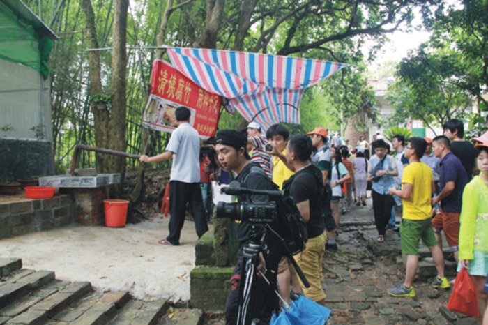 纯手工豆腐制作现场 据了解,龙门县功武村2002年被评为广东省文物保护单位,目前正在申报“广东省古村落”。整个功武村古建筑群,包含了五宅第、古码头、正街、廖氏宗祠等。功武村四面环山,古时风水先生视此处山行地势有利,龙关蜿蜒。龙关,俗称龙脉。清朝康熙年间,曾建牌坊,题名为“万里龙关。”穿村而过的香溪河养育着这个物产丰富、古风遗存的村落,吸引了众多游人前往游览。村民廖河清拥有一手制作腐竹的传统手艺,在家门口建起了半开放式的工坊现场制作腐竹、豆腐花和豆浆,供游客参观和购买。这也便是我们摄制组当天到达的第一站——“清姨腐竹”店。在现场,正值端午前夕,一批批涌入而来的游客在乘坐完竹筏上来时,都会禁不住豆腐花飘出的香气,现场买一碗来尝尝。而摄制组则将这一幕代表当地饮食文化特色的手工制作过程记录了下来。