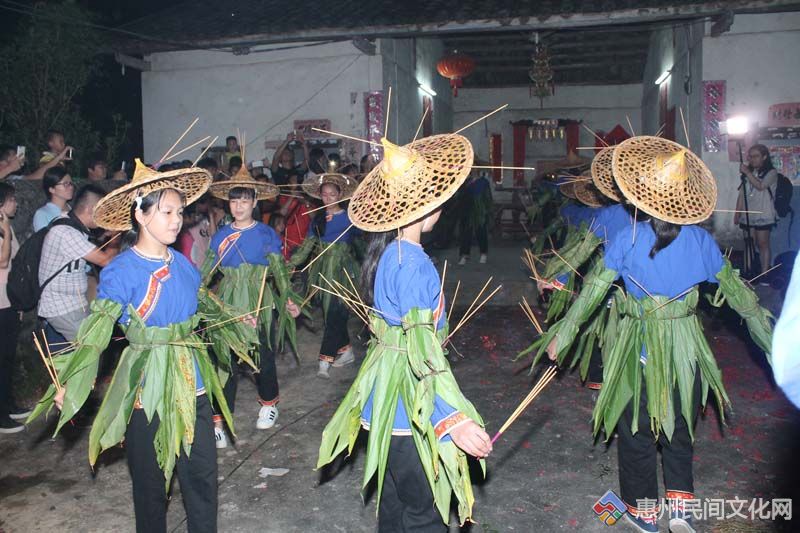 仪式开始了,少女们首先走到祠堂叩拜先祖,祈求风调雨顺。接着在地塘(晒谷场)围成一圈,双手向前靠拢,跳起火狗舞,唱起瑶家歌谣。然后穿街过巷,到村中厨灶前舞拜,又绕菜园一圈,每到一地,唱起不同的歌谣。最后,游舞到村外河边,将身上的黄姜叶、竹笠和香火统统扔到河里,象征祛除邪气。此时,对岸的男青年便开始与少女们对歌。
