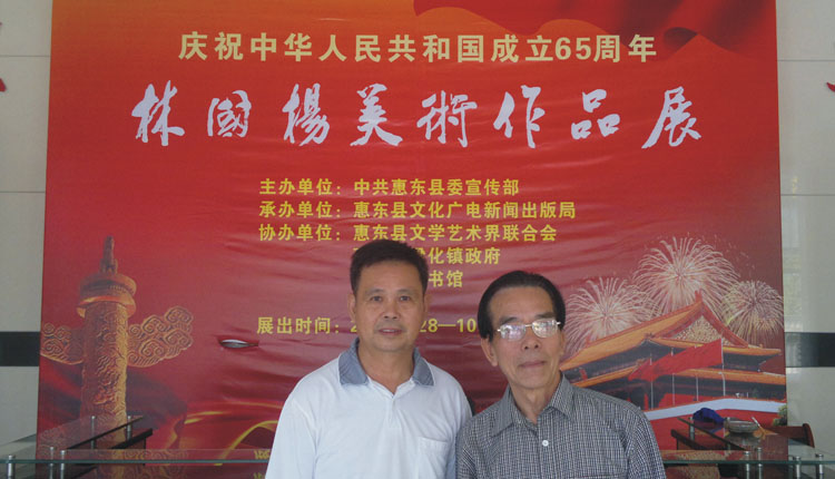 林国扬是国内知名画家,籍贯惠东梁化,长期工作于深圳。今年65周年国庆期间,惠东县在县文化中心图书馆一楼举办“林国扬美术作品展”,这是林国扬美术作品首次在家乡惠东县城展出,也是惠东县首个人物中国画、现代山水画和花鸟画作品展。幅幅皆精品,满室驻春光。展出期间,林国扬的60多幅力作受到家乡人民和广大美术爱好者的称赞。“少小离家老大回,乡音无改鬓毛衰”,林国扬离开家乡到深圳业已三四十年时间,虽两地相隔不远,但也思乡心切,今以年近古稀回乡办展,以画寓情,乡愁愈甚。故此次画展其选立“游子归来,乡音依旧”为主题,亦颇见用心良苦。 作为梁化外出名士,林国扬现是国际事务国务院宾礼特供艺术画家、中国美术艺术家协会会员、深圳市老年书画协会副会长、深圳市山谷画院名誉院长和艺术总监,是特区画坛精英之一。他是深圳早期绘画艺术工作的垦荒牛和开拓者,也是改革开放深圳第一幅《邓小平》巨幅画像的其中一位参与策划绘图者。 丹青能夺造化功 林国扬是广东龙形拳宗师林合的第四代嫡孙,其兄林国财是龙形拳第四代传人,亦是抗美援朝志愿军中的“孤胆英雄”,并在战斗中受重伤被打瞎一只眼,成为二级残废军人。其弟林国威是七十年代初的复退军人,亦是龙形拳的拳师。林氏三兄弟一文两武,文武并驾。林家与周、苏等三家的祖上是最早徙居梁化圩的三姓人家,均开基定居于梁化圩柴行街,互邻互依,人们习惯称“周、苏、林”。据说,早期龙形拳也是在互邻的“周、苏、林”三姓子弟中传练。其中林国扬所在的林家,与笔者周屋老家分处街两边,侧邻相望,距离很近。林国扬从小就受到“忍气让人非我弱,留心守道任他强”的本家“尚武精神”熏陶,谦虚谨慎,勤奋好学,克己守礼。长大后根据自己“崇文嗜画”的爱好,走出另一条自我提升、自我发展的道路。小时候,颇有天赋的林国扬就对美术感兴趣,喜欢在地上画着玩。读梁化小学、中学时,对美术画画更为着迷,在美术老师的指导下,对素描、小粉画、水彩画、油画等基本功勤于练习,打下了一定的基础。上世纪60年代初,林国扬中学毕业后,考入惠阳山歌剧讲习班,经过两年的学习培训,成为惠阳山歌剧团一名美术工作者,具体负责剧团舞台美术设计和布景绘制。惠东从惠阳析出置县后,他调回惠东山歌剧团负责美术工作,之后被调到县文化局文化馆,从事美术创作和培训工作。要知道,那个年代找份正规工作很困难,能找到自己喜爱又适合自己发展的工作更是难上加难。记得1963年我读小学时,那年暑假,我的一位读平潭高中的同房堂叔,名叫周观玉,他能拉一手好二胡,毕业参加高考后在家呆着,一个月过去了还没接到录取通知,心情郁闷,坐在中厅屏风石脚栏拉二胡。“观玉,不要再等了,我看还是学国扬那样,到县上去考考拉二胡,看剧团能不能要人。”在旁的一位叔公劝他说。周观玉没吱声,而是一直埋着头在拉他的“闷胡”。当时我刚好在场,亲见这一情景,至今记忆犹新。不过,我那位堂叔不久接到了通知书,考上了中山大学。这虽然是一个小插曲,但从中可见,那时大家都把林国扬看作是个人奋斗求上进的一个样板,羡慕他,学习他。 在惠阳、惠东工作期间,林国扬在学生时代涉猎的各种美术画体的创作水平进一步提高,尤其在人物绘画方面,更臻成熟。我年少时,亲眼看过他在其兄林国财家里的客厅墙壁上作画,画的是“毛主席去安源”,当时感觉他画的很像很逼真。他在剧团工作时,曾负责并参与山歌剧《社长女儿》、《红云崖》和歌剧《江姐》等10多个剧目的美术设计和布景绘制工作。他在文化馆工作时,曾参与县政府及下属单位组织的各种宣传展览活动,如农业成果展、计划生育展、安全教育展等展览,负责每次展览版展设计和美术创作;创作了一批反映“小星山战斗”和农业生产典型等内容的《连环画》,制成幻灯片在全县巡回播放;通过举办各类美术培训班,精心培养美术人才,惠东的张年才(中国书画家协会副主席.)、叶来聪(惠州市美术家协会会员)、周胜金(中国摄影家协会会员、惠东县摄影家协会主席)等一批书画摄影人才,均是他当年的学生。由于成为美术专业的多面手,尤其是擅长于巨幅人物油画方面的创作绘制,林国扬曾被广东省军区政治部、惠阳军分区、惠阳地区革委会、惠东县革委会及其下属等一些单位指名借用,协助绘制巨幅宣传画和毛主席、周总理等领导人物画像,在惠阳地区颇有名气。他的一位美术老同行曾这样称赞他:“七十年代,林国扬活跃、精明,油画、粉画、国画、书法、美术字样样能干,是大家喜欢的朋友。” “始知丹青笔,能夺造化功”,藉以唐代岑参这一诗句活用之,一支普通的画笔,不仅为林国扬的命运转折带来了“造化”之功,也为他的画技得以不断的淬炼提升筑造了很好的平台。 宝剑锋从磨砺出 如果说练画如磨剑,林国扬在惠阳、惠东只能说出炉成剑,真正淬火锻打、磨砺成锋还是到了深圳。改革开放伊始,林国扬也和众多有识之士一样,奔向了深圳,成了深圳的第一代移民。1979年冬,他被调入深圳市文化局工作。局里安排他创办了全国首家的“深圳美术广告公司”,并在深圳为中国重型机械制造厂、交通银行、北京同仁堂等制作了第一批巨型广告,矗立在深圳的火车站繁华地段。同时,受命负责筹办深圳外文书店和“深圳